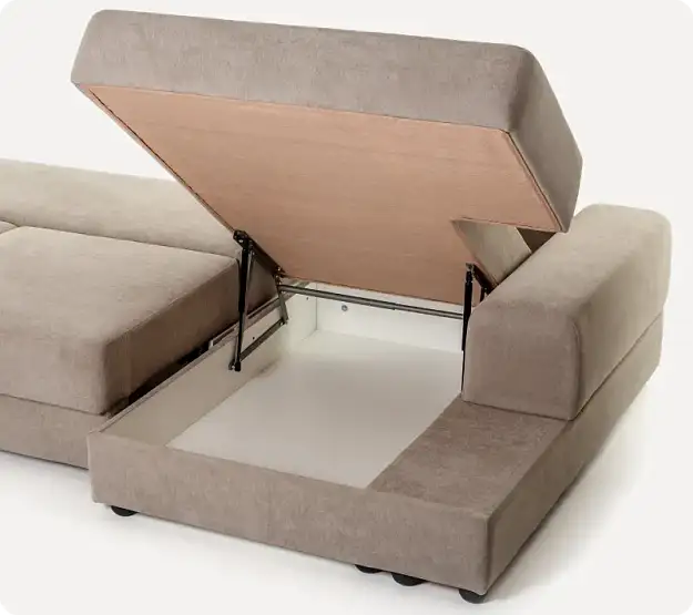 Оттоманка (левая / правая)Это такой квадратный модуль без спинки. Тоже есть подъемный механизм и короб для белья. Ставится обычно с краю, чтобы делать диван Г-образным или П-образным. На ней удобно лежать или сидеть, подложив подушку. Кстати, ящик внутри — полноценный.